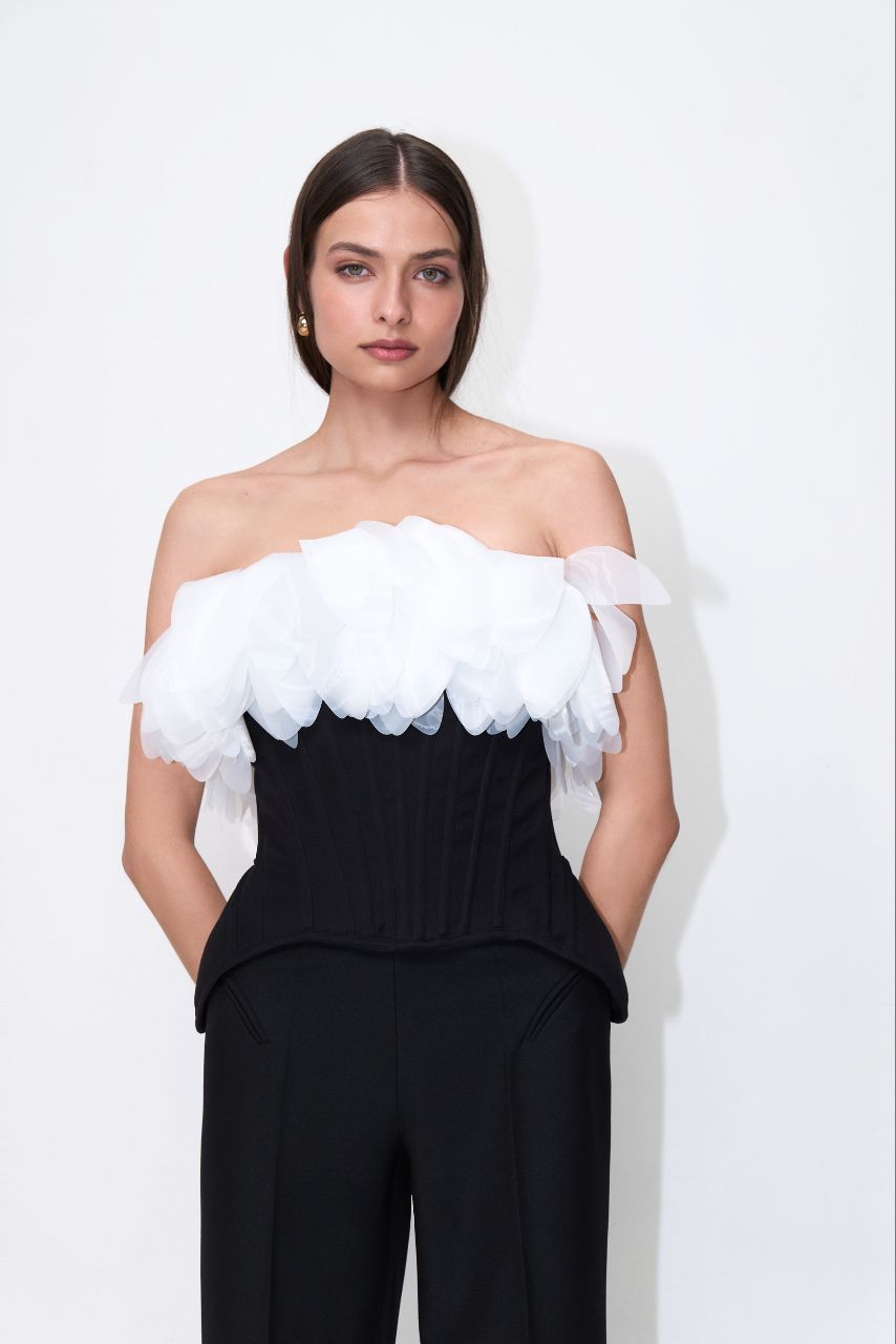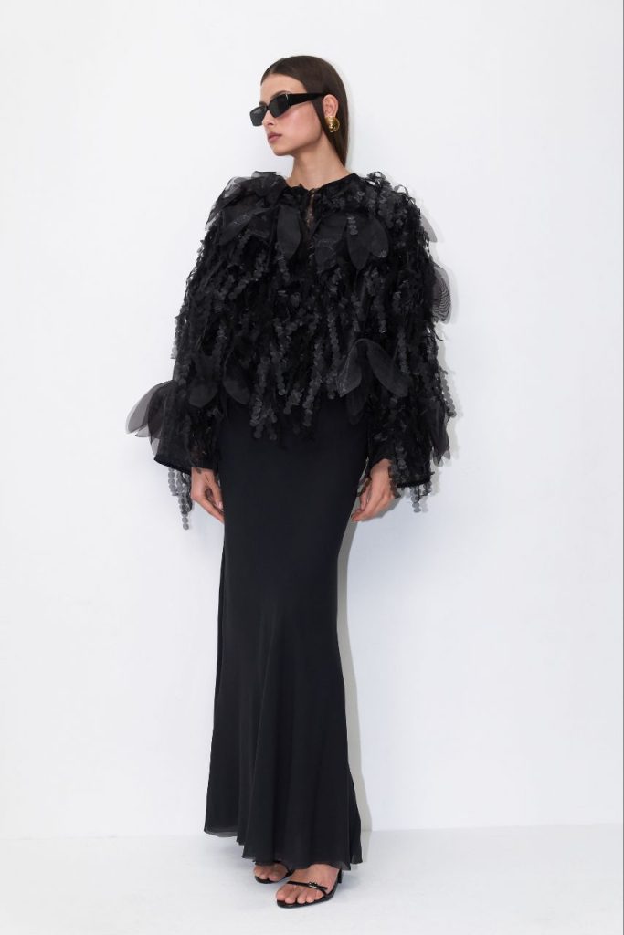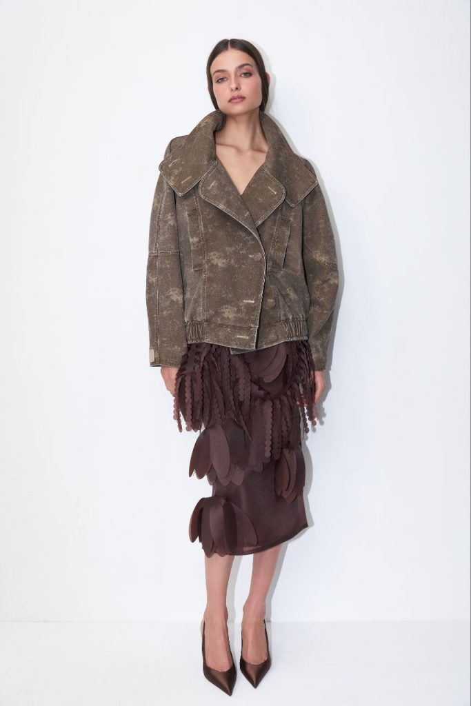 Напівпрозорі шифонові кейпи та топи з квітковими аплікаціями креативна директорка бренду Мальва Вербицька поєднує з лаконічними вовняними костюмами, а сукні з делікатного мережива шантильї — з оверсайз-куртками та бомберами зі структурованої шкіри. Кольорова палітра колекції варіюється від білого й небесно-блакитного до насиченого чорного та глибокого шоколадного.