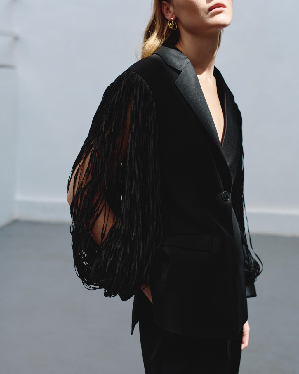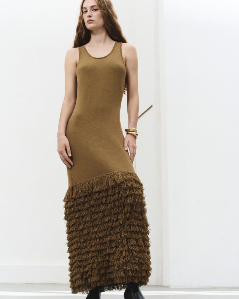 Бренд переосмислює свою знакову деталь – бахрому. Тепер вона не просто декор, а інструмент динаміки. Інтегрована в рукави блейзерів та подоли суконь, вона оживає при кожному русі, змішуючи відтінки в гіпнотичному танці.