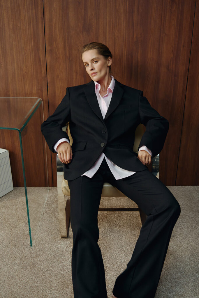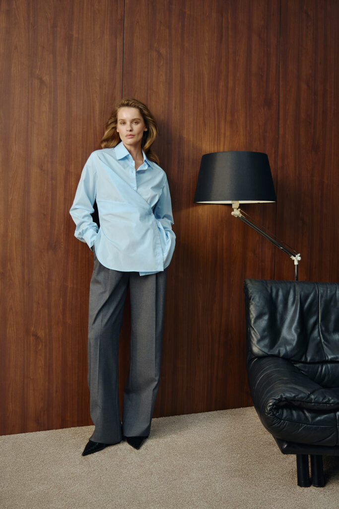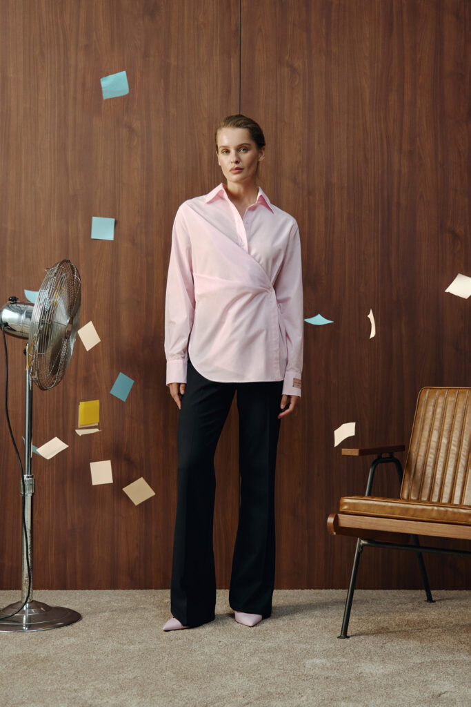 У цій співпраці VIKA ADAMSKA виходить за межі звичного, поєднуючи фірмовий комфорт зі складнішими силуетами в стилі office core. Колекція містить асиметричні сорочки, класичні брюки, оверсайз-костюми, мініспідниці та елегантне двобортне пальто. Особливого шарму додають атласні сукні та унікальні деталі — стікери-етикетки на одязі. Ці елементи роблять колекцію особливою і підкреслюють її унікальний концепт.