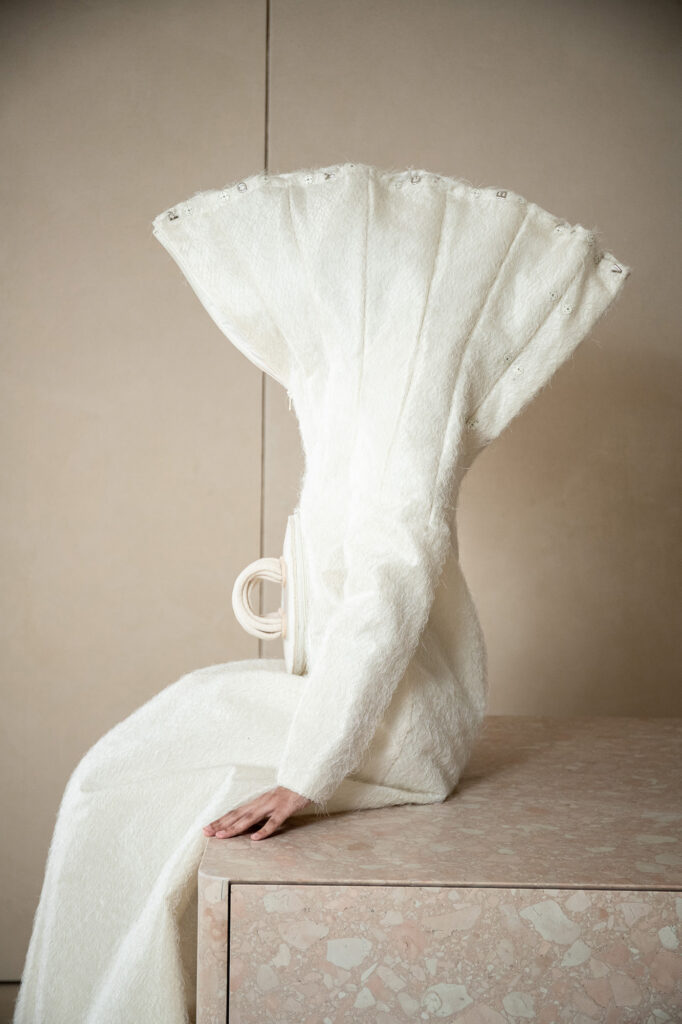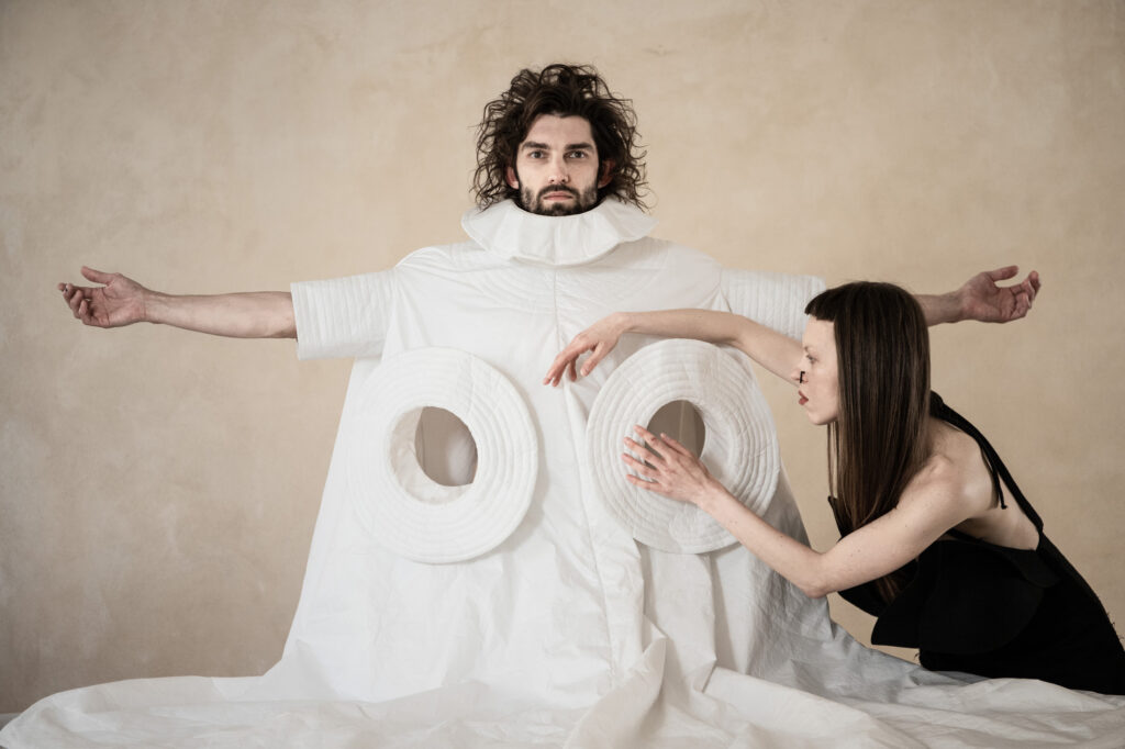 DZHUS запрошує зануритися в фантасмагорію “ANTICON”, матеріалізовану в унікальному просторі Concept_11 у Варшаві. Колекція спекулює на ‘кодах утопії’, згенерованих людством у прагненні запрограмувати щастя. Розшифровуючи власну особисту травму, Ірина Джус насичує свій катарсичний театр костюму наративами соціокультурного конформізму. Виходячи з переконання, що розчарування росте на очікуваннях, творчиня іронізує щодо систем умовних позначок протягом усієї історії цивілізації.