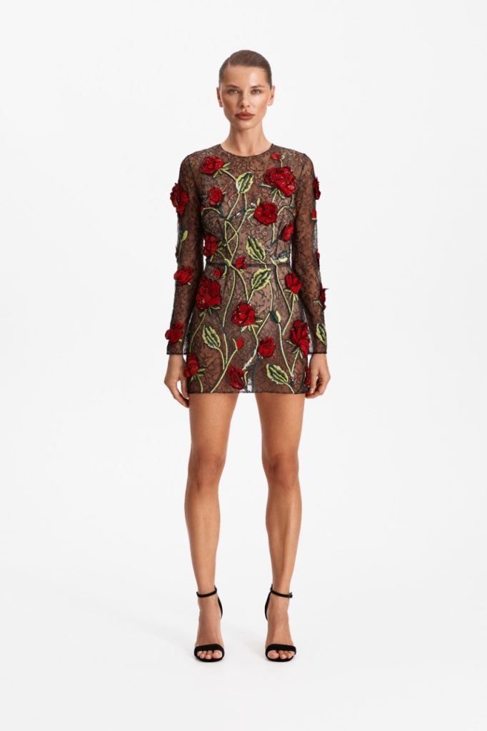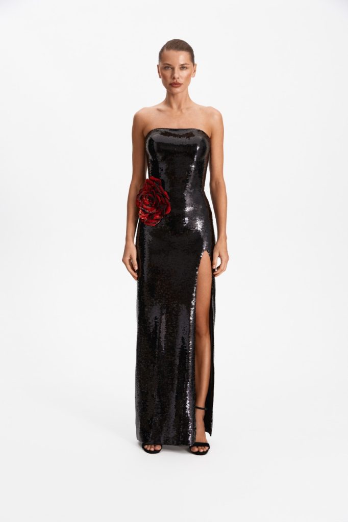 Троянда, як головний символ лінійки, з’являється майже на кожній сукні: то як один акцентний бутон, то як каскад пелюсток, що огортають фігуру. Їхня об’ємна фактура і глибокий відтінок червоного контрастують із чорним – кольором вічної класики. Бренд навмисно звертається до лаконічності кольорової палітри, роблячи чорний головним кольором колекції – він як тло для пристрасті, домінує, дозволяючи рукотворним трояндам стати головним емоційним акцентом. Ефект м’якого сяйва кожного виробу створюють фактури, що вибрані з ювелірною точністю: оксамит, мереживо, паєтки.